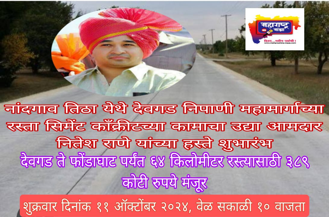 नांदगाव तिठा येथे देवगड निपाणी महामार्गाचे रस्ता सिमेंट काँक्रीट कामाचा उद्या आमदार नितेश राणेंच्या हस्ते शुभारंभ