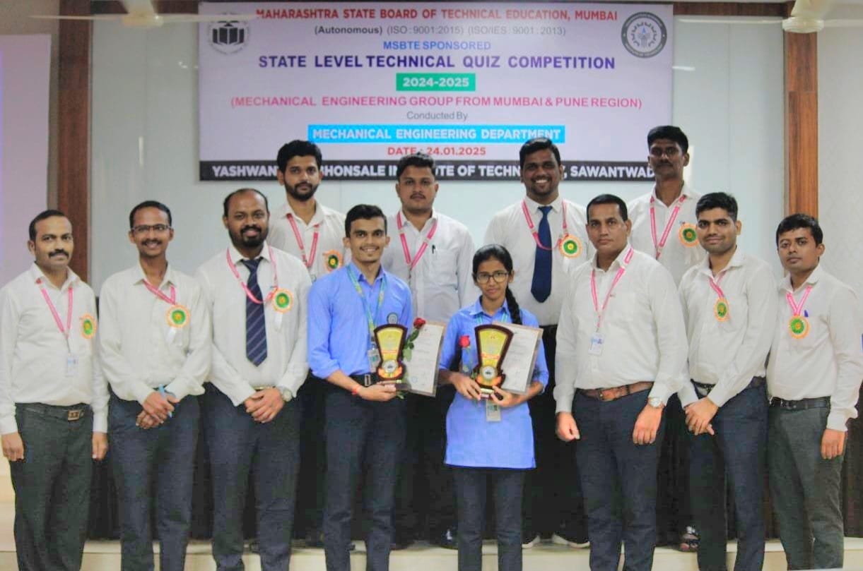 महाराष्ट्र राज्य तंत्रशिक्षण मंडळ पुरस्कृत राज्यस्तरीय टेक्निकल क्विझ कॉम्पिटिशन यशवंतराव भोसले इन्स्टिटयूट ऑफ टेक्नॉलॉजी येथे पार पडली. मेकॅनिकल शाखेच्या विद्यार्थ्यांसाठी आयोजित या स्पर्धेत मुंबई व पुणे विभागातील एकूण अठरा तंत्रनिकेतन संस्था सहभागी झाल्या होत्या. स्पर्धेचे उदघाटन संस्थेचे कार्याध्यक्ष अच्युत सावंतभोसले यांच्या हस्ते करण्यात आले. यावेळी प्राचार्य डॉ.रमण बाणे, उपप्राचार्य गजानन भोसले, शासकीय तंत्रनिकेतन, रत्नागिरीचे अधिव्याख्याता व परीक्षक अमोल धांडे, सचिन लांजेकर, मेकॅनिकल विभागप्रमुख अभिषेक राणे उपस्थित होते.