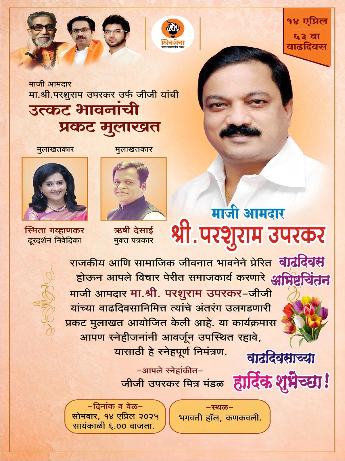 माजी आ. परशुराम उर्फ जीजी उपरकर यांची १४ एप्रिल रोजी सायं. ६ वा. भगवती हॉल, कणकवली येथे उत्कट भावनांची प्रकट मुलाखत होणार आहे. ही मुलाखत दूरदर्शन निवेदिका स्मिता गव्हाणकर व मुक्त पत्रकार ऋषी देसाई हे घेणार आहेत. राजकीय आणि सामाजिक जीवनात भावनेने प्रेरित होवून आपले विचार पेरीत समाजकार्य करणारे माजी आम. परशुराम उर्फ जीजी उपरकर यांच्या वाढदिवसानिमित्त त्यांचे अंतरंग उलगडणारी प्रकट मुलाखत आयोजित केली आहे. या कार्यक्रमास जीजी उपरकरप्रेमींनी उपस्थित रहावे, असे आवाहन जीजी उपरकर मित्र मंडळाने केले आहे.