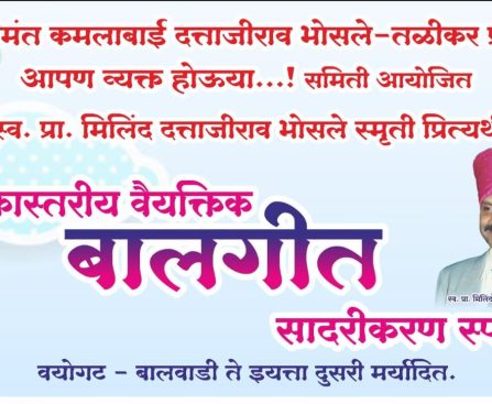 सावंतवाडी (प्रतिनिधी) तालुकास्तरीय वैयक्तिक ”बालगीत सादरीकरण” स्पर्धा ; स्व. प्रा. मिलिंद भोसले स्मृतिप्रीत्यर्थ आयोजन स्व. सुभानराव भोसले स्मृती शैक्षणिक सेवा सन्मानाने गुरुवर्य व्ही.बी.नाईक यांचा होणार गौरव स्व. श्रीमंत कमलाबाई दत्ताजीराव भोसले-तळीकर प्रतिष्ठानच्या आपण व्यक्त होऊया…! समिती तर्फे सावंतवाडी तालुक्यातील बालवाडी ते इ. दुसरीच्या विद्यार्थ्यांसाठी ”तालुकास्तरीय वैयक्तिक बालगीत सादरीकरण स्पर्धा २०२५”चं आयोजन करण्यात […]